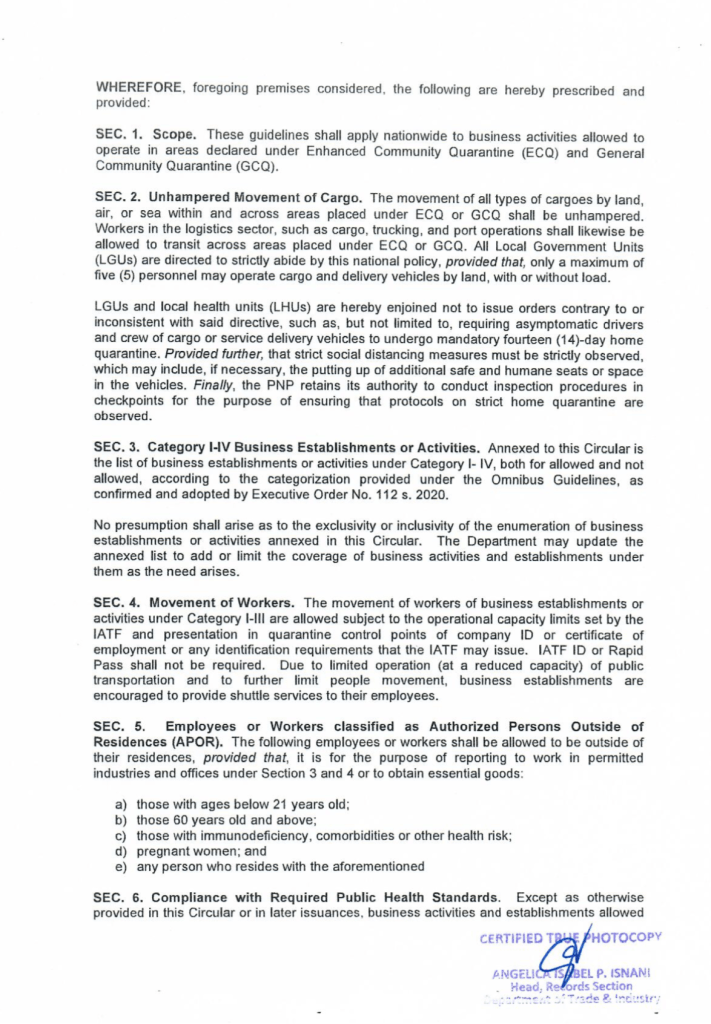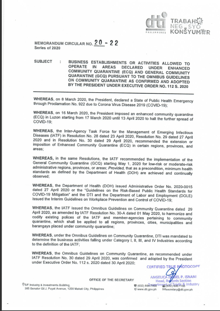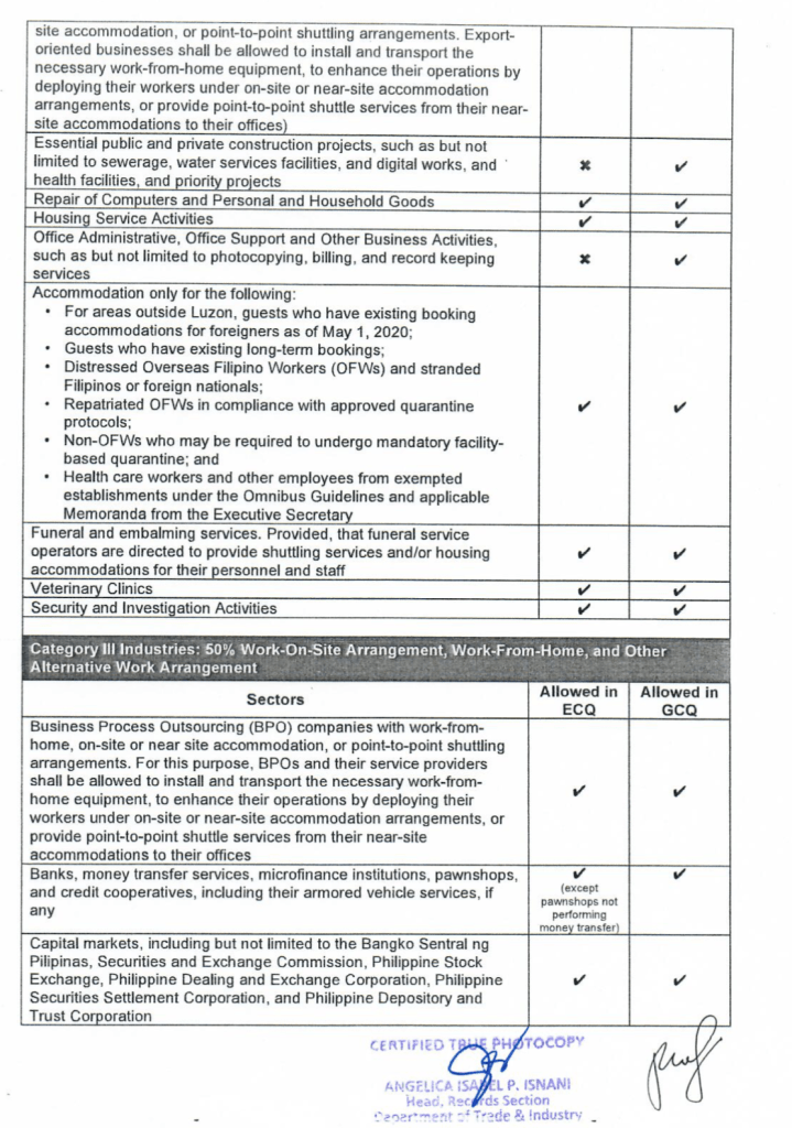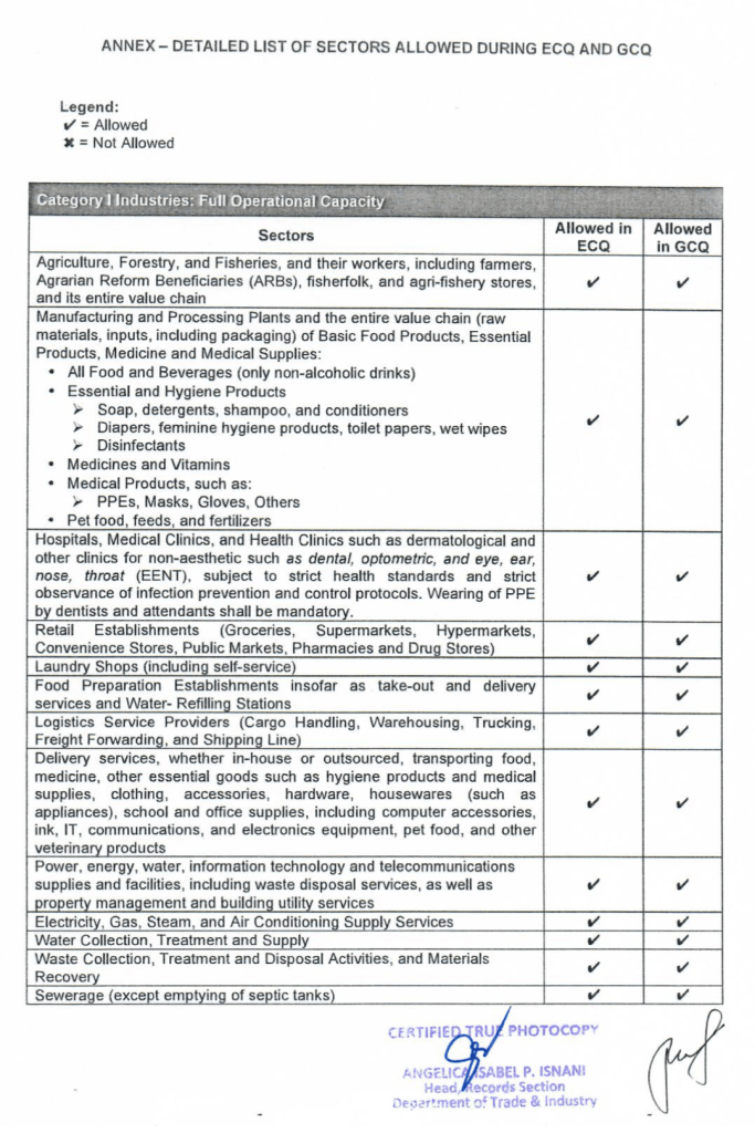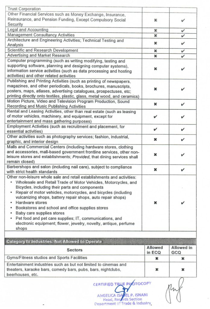 This is according to the DTI Memorandum Circular released on May 5, 2020, detailing the list of business establishments or activities allowed to operate in areas under GCQ, as confirmed and adopted by the President under Executive Order Number 112 S. 2020. The guidelines state that Real Estate Activities, including leasing, buying, selling, subdividing, appraising and development of cemetery and columbarium are among the allowed activities once the GCQ is implemented.
